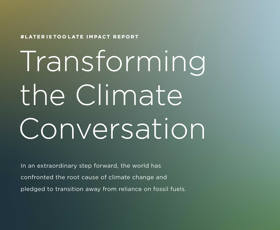 Sierra led #LaterisTooLate which garnered 27 million social media impressions within 48 hours featuring thought-leaders like Jane Goodall, Mark Ruffalo, Ellie Goulding, and Jane Fonda during United Nations COP29.